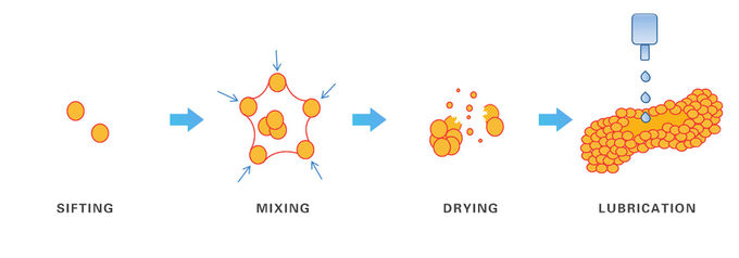 Mieszanie: W celu dokładniejszego wymieszania stosuje się proces mieszania na sucho. Po zakończeniu mieszania płyn granulacyjny dodaje się do granulatora szybkiej mieszanki lub RMG.